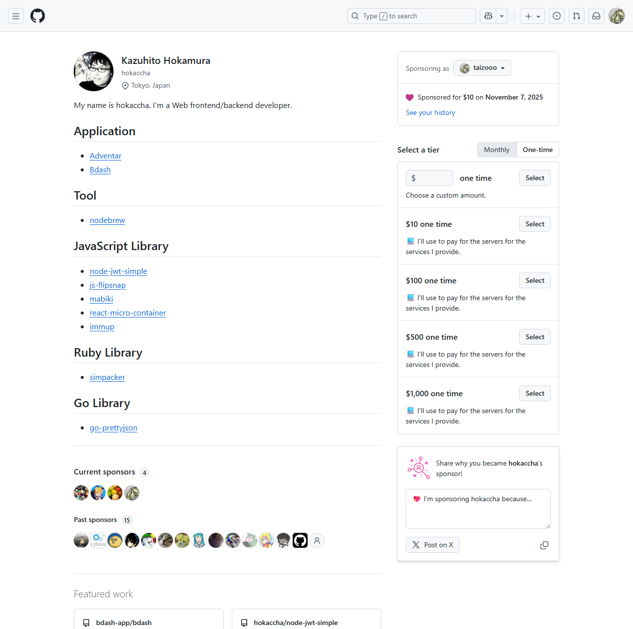 Sponsor @hokaccha on GitHub Sponsors · GitHub