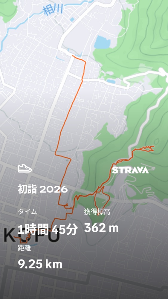 愛宕山、甲斐奈神社元宮、夢見山、大笠山から舞鶴城公園まで、1時間45分。初めて strava を起動してみた。